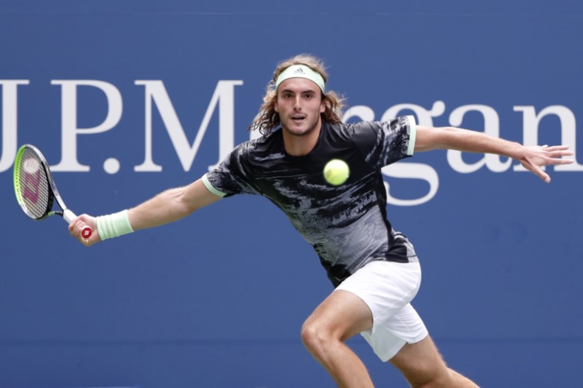 Aug 27, 2019; Flushing, NY, USA; Stefanos Tsitsipas of Greece hits a forehand against Andrey Rublev of Russia (not pictured) in the first round on day two of the 2019 U.S. Open tennis tournament at USTA Billie Jean King National Tennis Center. Mandatory Credit: Geoff Burke-USA TODAY Sports