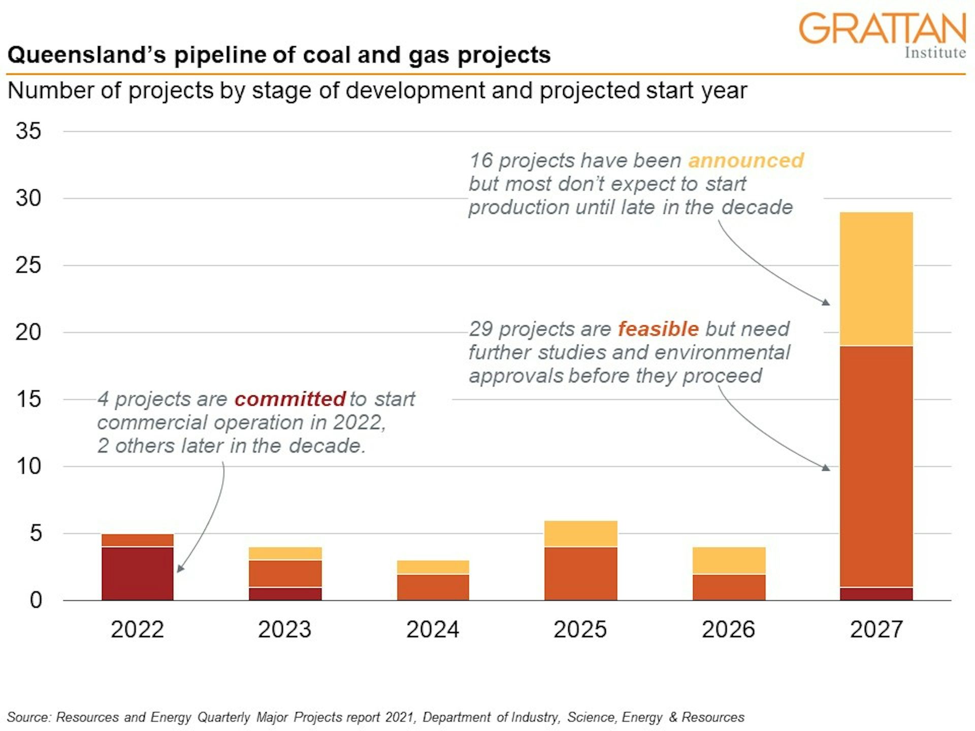 The most recent government dataset lists 44 coal projects and nine gas projects in Queensland. Two of the gas projects have already started production, so we discounted these from our analysis.