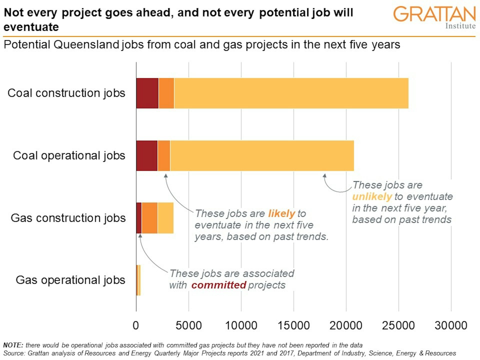 If this trend is repeated over the next five years, just one in two Queensland gas projects and one in 16 Queensland coal projects would proceed. This would mean Queensland could expect 4,406 new coal and gas jobs, comprising: