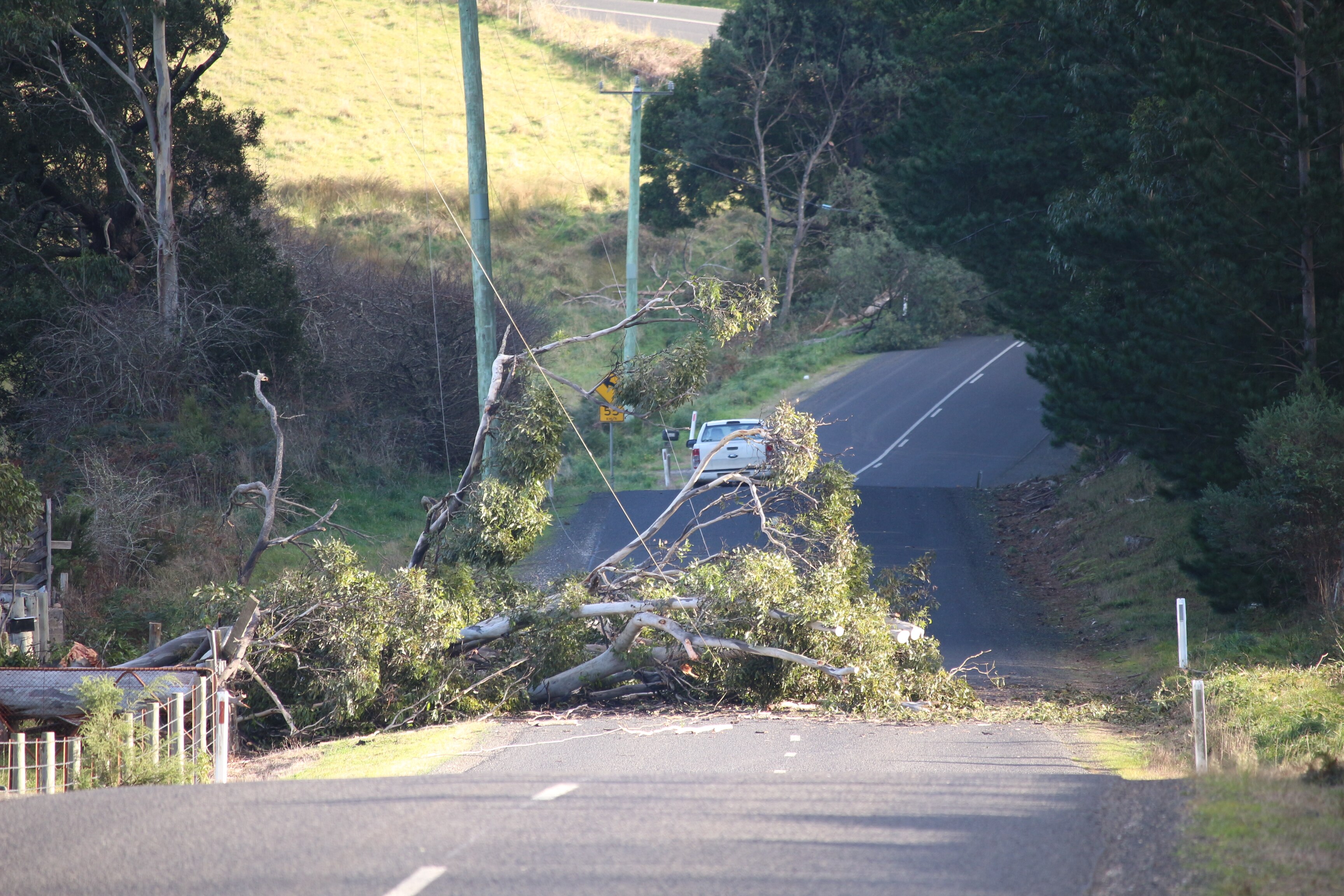 Several roads across Tasmania remain closed due to damaging winds that brought powerlines and trees down.