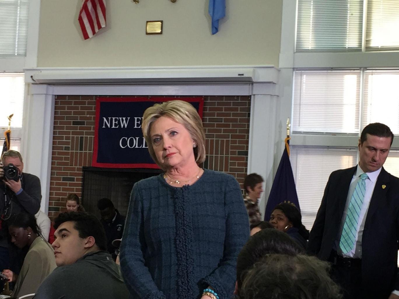 The former secretary of state told the 405 students who crowded inside the hall at the New England College in Henniker, that she understood many young people were supporting her rival, Senator Bernie Sanders. She said she wanted to answer questions not just from her supporters, but from those opposed to her.