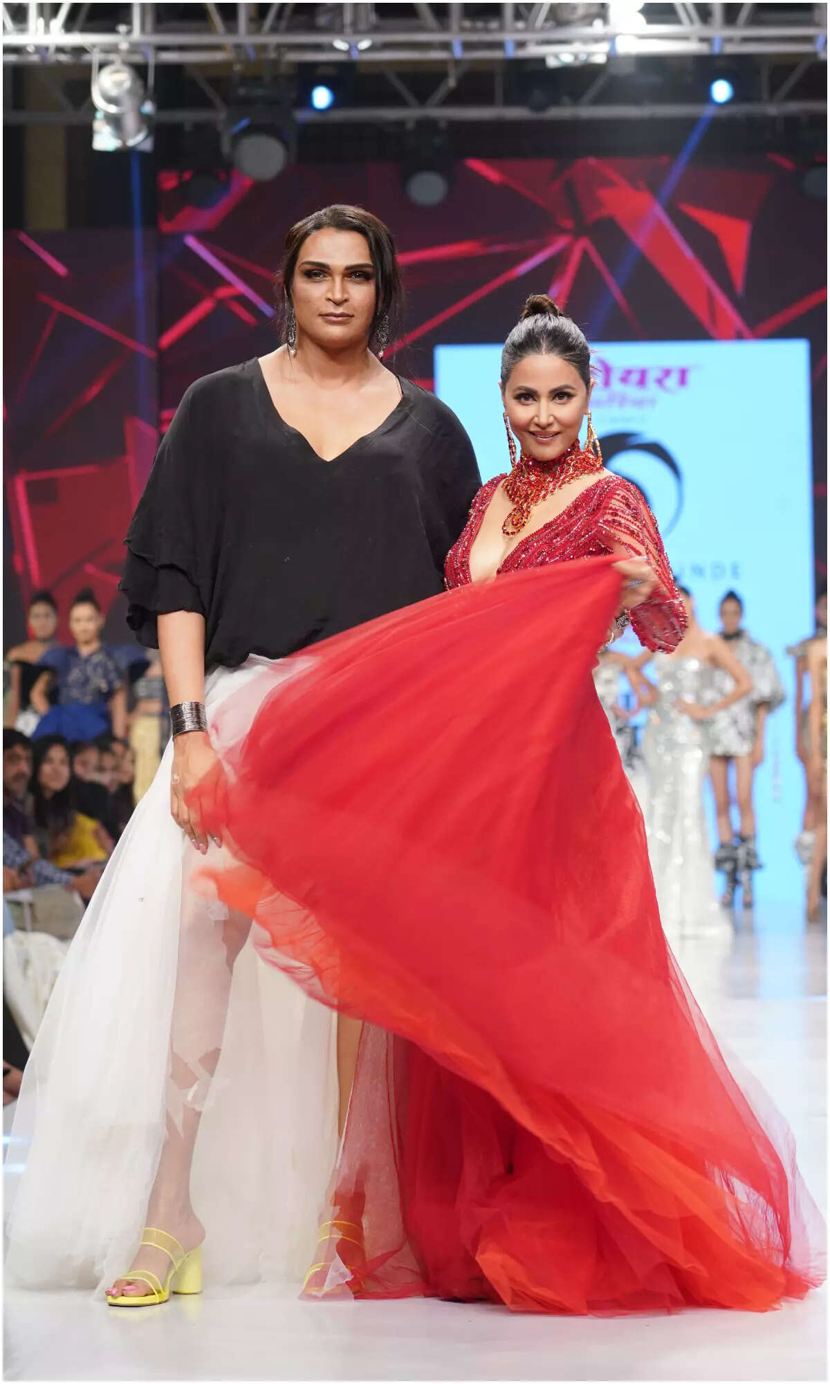 Designer Saisha Shinde did her first fashion show after coming out as a transgender woman at Indore Times Fashion Week. It was a glamourous soiree with dazzling and avant-garde designs being showcased on the ramp. Actor Hina Khan sauntered down the runway for the designer wearing a ravishing red gown with a plunging neckline. She looked sensational.