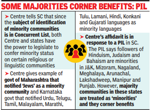 Responding to a PIL filed by advocate Ashwini Upadhyay, the Union government in an affidavit said that since the subject of identification of minority communities is in the Concurrent List of the Constitution, both the Centre and the states have the power to legislate to confer minority status on certain religious or linguistic communities which are in minority in the country or a particular state.