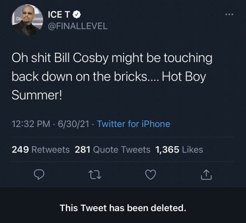 Ice-T posted and deleted a tweet about Cosby having a "Hot Boy Summer." Slim Thug posted on Instagram the meme of Squidward jealously looking through the blinds at a joyous Spongebob Squarepants under "R. Kelly watching Bill Cosby get released from prison." Serial troll and shameless self-promoter 50 Cent saw no problem with posting a funny video of Cosby with a caption that read "LOL. Bill Cosby back on the loose, catch FOR LIFE on IMDB Tv," referencing the drama series he executive produces which ABC cancelled. Some hip-hop artists like Kid Cudi expressed shock and disgust in the news of Cosby's unexpected release, but the jocular tone of others was depressingly predictable.