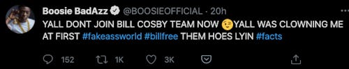 Timbaland's post was pleasant compared to the repulsive victory lap that rapper Boosie Badazz took once he found out a convicted sex offender was released on a technicality. First, he posted a video on his Instagram account to welcome Cosby home and implied Cosby's release was ordained by God. The caption to the video read "#BILLFREE HA HA YALL LYING ASS HO** HURT TODAY," a sentiment he decided to share on his Twitter account later in the day.