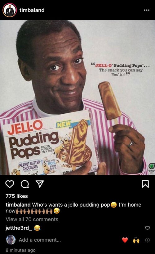 Legendary hip-hop producer and VERZUZ co-creator Timbaland waited no more than 10 minutes after the news broke to post a photo of one of Cosby's Jell-O Pudding Pops advertisements with the caption, "Who wants a jello pudding pop. I'm home now." The post remained up for hours before it was removed, with no apology provided. This is the same man who not only had no problem giving an alleged woman abuser like Soulja Boy his VERZUZ platform after the allegations were made public.