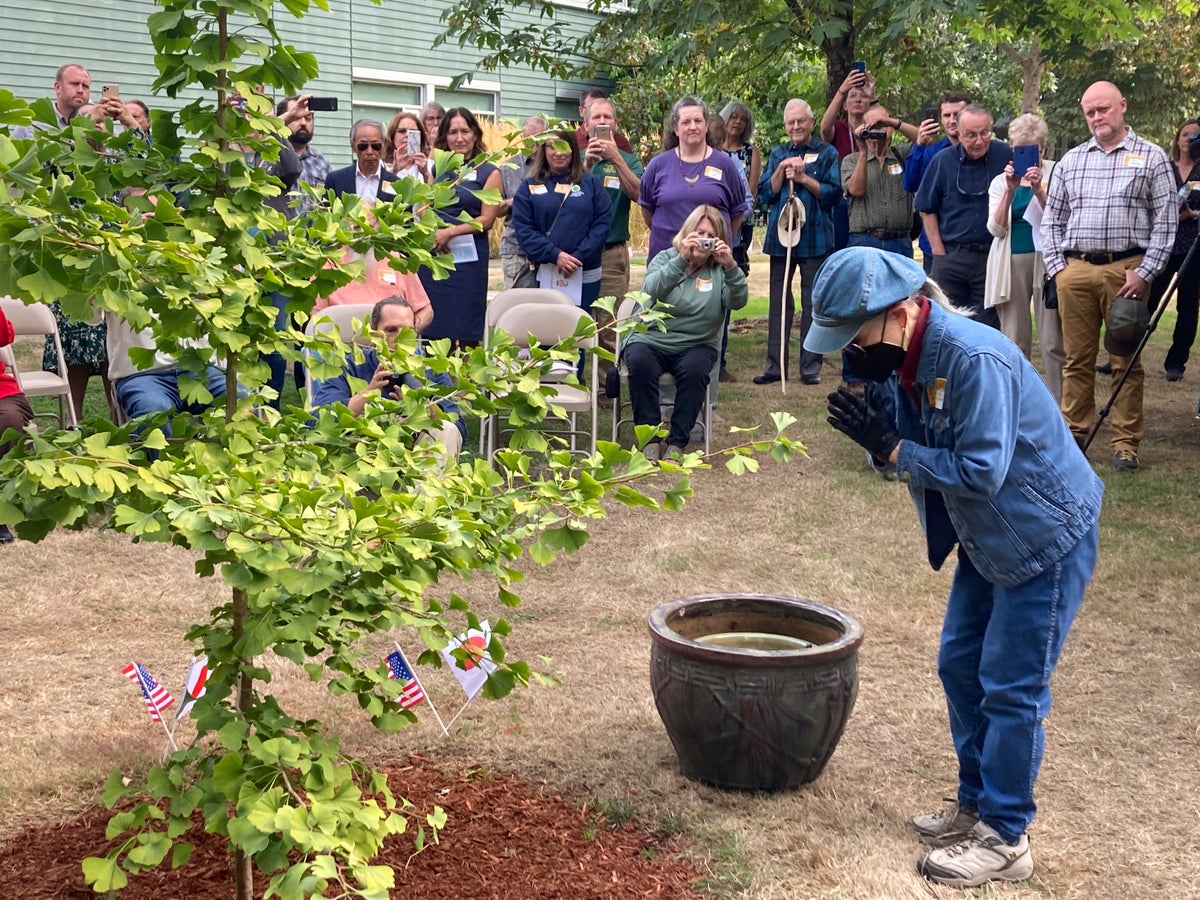 At the ceremony in Oregon, Tamura Snider, who emigrated to the United States decades ago and lives in Medford, went outside to one of the peace trees, a ginkgo, on the forestry department grounds, with dozens of other people. She bowed before the tree and watered it with a ladle. Others queued up to also water it.
