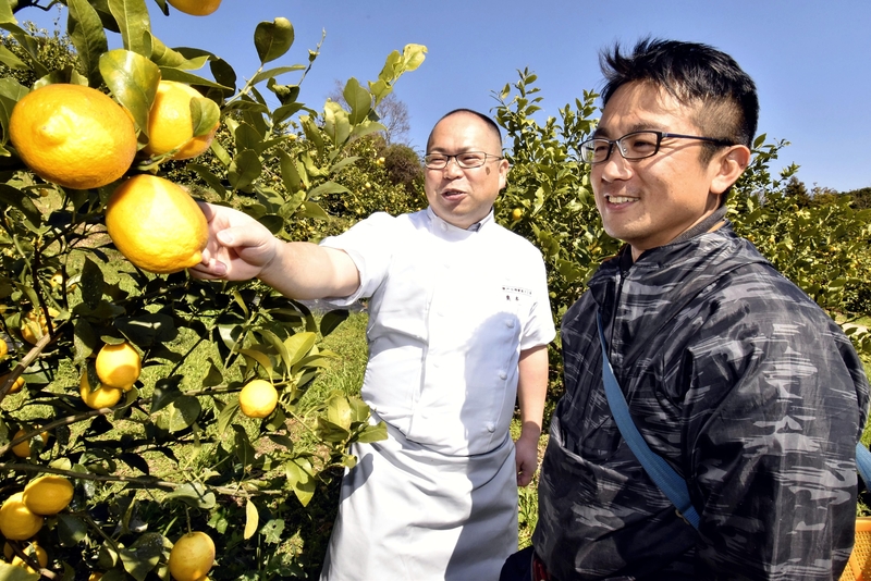 Mitsuaki Harada, a 36-year-old lemon farmer who supplies lemons to Okumoto, returned from Higashi-Hiroshima, Hiroshima Prefecture, last spring to take over the orchard of his 67-year-old father, Satoru.