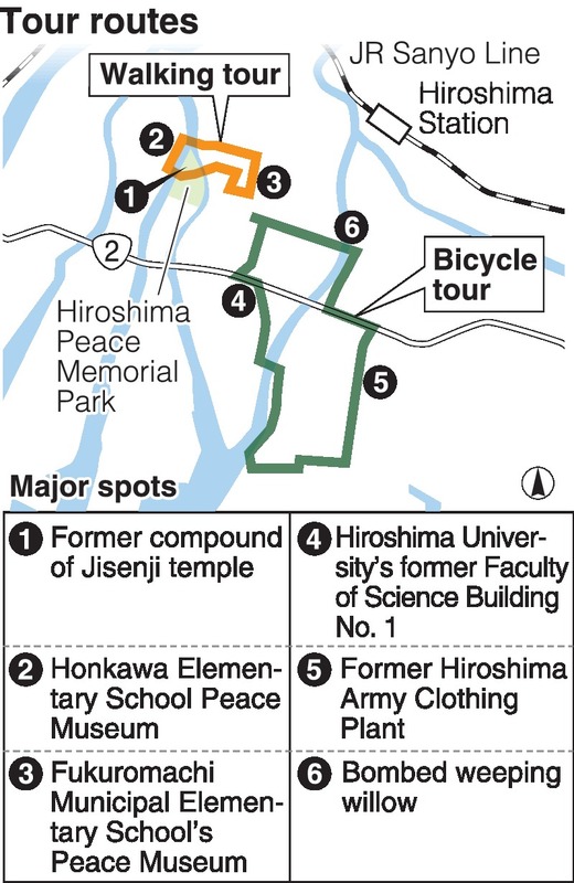 The panel categorized about 53 locations in Hiroshima Prefecture related to peace, such as memorial monuments and remains from the bombing, into four themes: bombed structures; culture and literature before and after the 1945 atomic bombing; the revival of public life; and bombing-related memorial museums. The sightseeing tours can be taken by bicycle, bus or on foot.