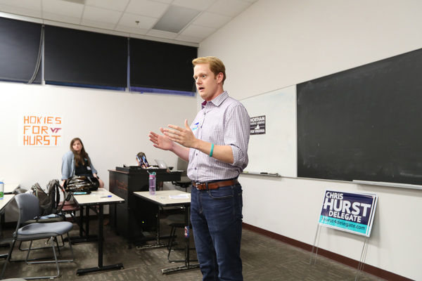 Instead, on a damp Tuesday after Labor Day he's standing in a Virginia Tech classroom, delivering a campaign speech tinged by loss to a couple dozen student activists and campaign volunteers. With boyish features and reddish blond hair, Hurst wears jeans, gray Adidas sneakers and a turquoise rubber wristband with the words "Alison Forever" and a date, 8/26/2015.