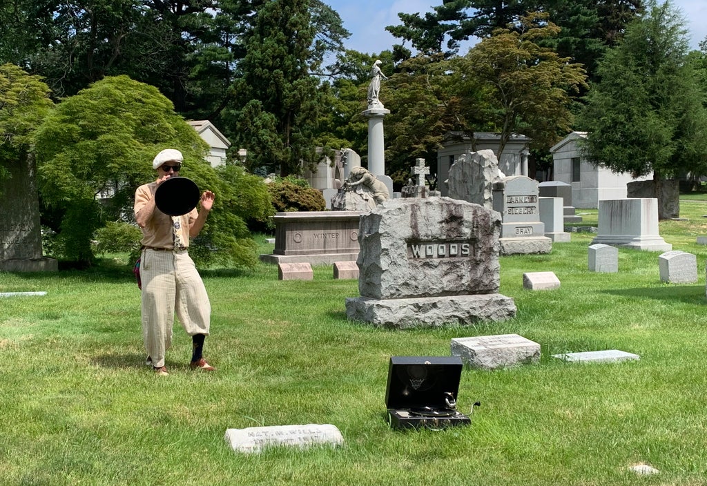 Michael Cumella, dressed in 1920s garb, laid his old Victrola record player down among the tombstones and turned to the small tour group assembled under the towering trees at Woodlawn Cemetery.