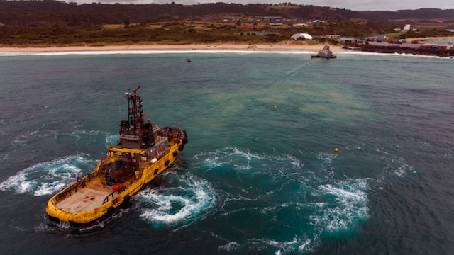 The two-part structure, designed as a type of artificial blowhole, was then tugged for 40 hours over to waters near Grassy on King Island's east coast where it began harvesting electricity and feeding it into the local grid.