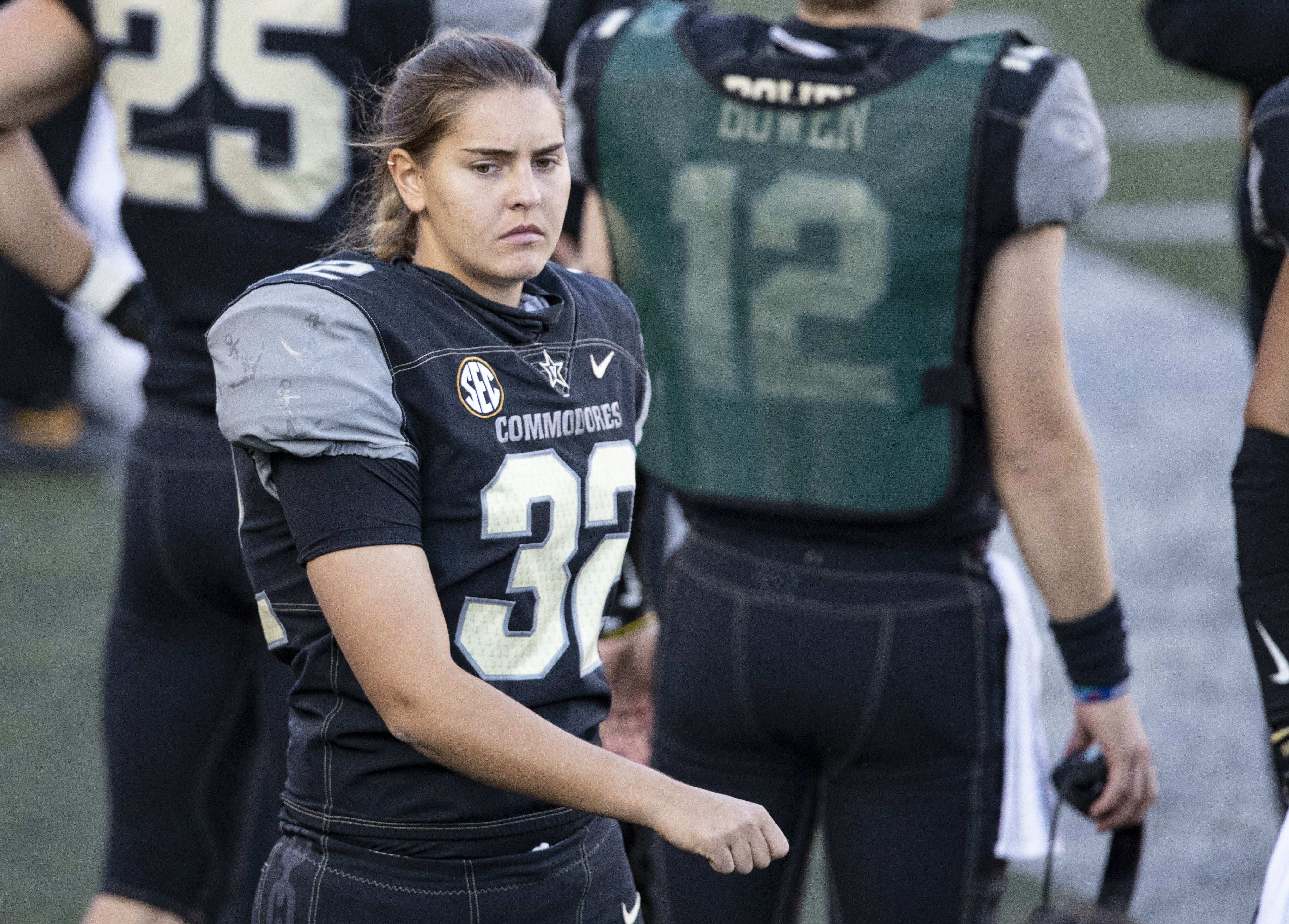 She became the first woman to play in a Power Five game Nov. 28 with a squib kick to open the second half of a loss at Missouri in the only time she got on the field in that game. She got another chance on Dec. 12, when Vanderbilt had only 49 scholarship players for its game against Tennessee.