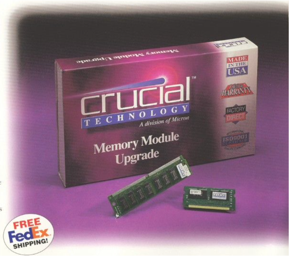 Crucial Technology, the consumer products arm of Micron announced that 2021 is its 25th anniversary. The image below is from an ad for Crucial’s memory modules from 1996. In 1996 Crucial was launched at Micron’s headquarters in Boise, Idaho with seven team members.