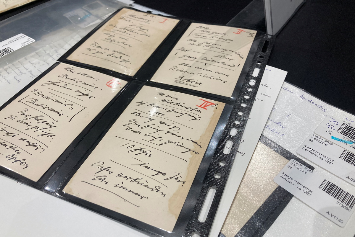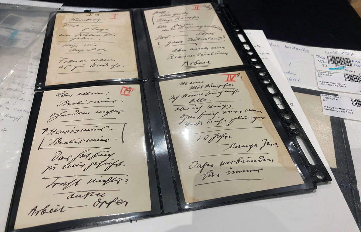 The set of cue cards bearing the phrase "Jewish problem", for a 1939 speech to graduating army officers, sold for 34,000 euros, while the notes for a 1935 speech to a winter aid charity with phrases like "collections are annoying" went for just 12,500 euros.