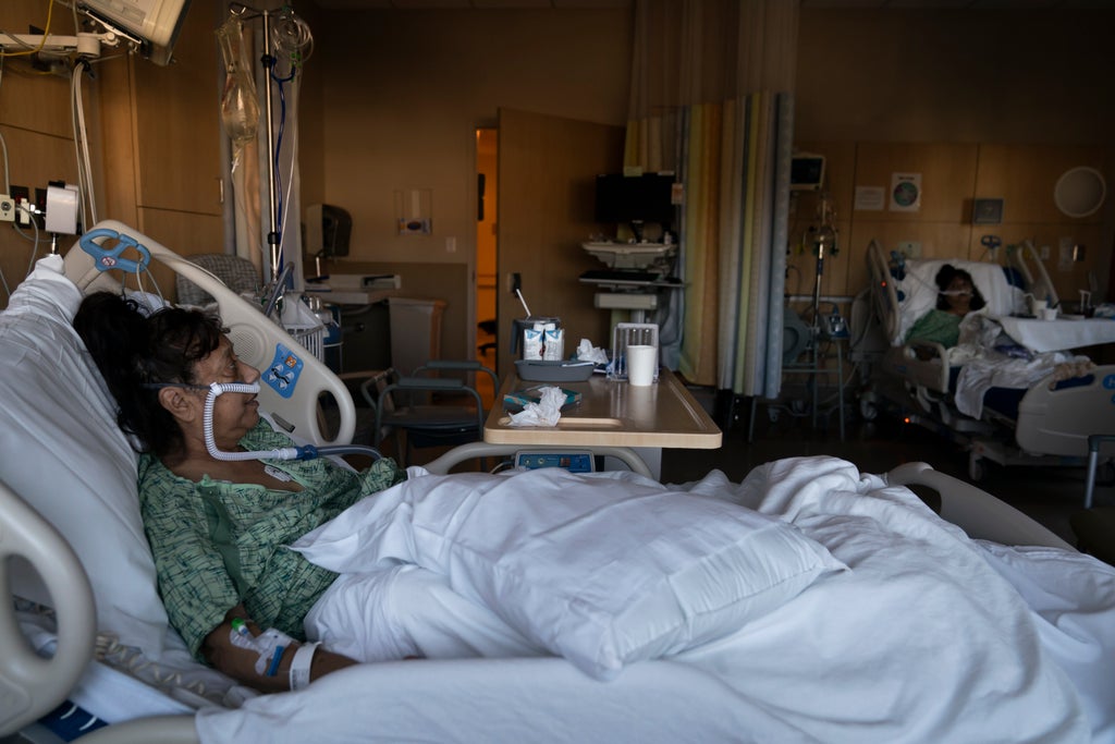 Twin sisters Linda Calderon and Natalie Balli, 71, had planned to get vaccinated but delayed it until it was too late. Now they're on oxygen in the same room at Providence Holy Cross, their beds separated by just a few feet.