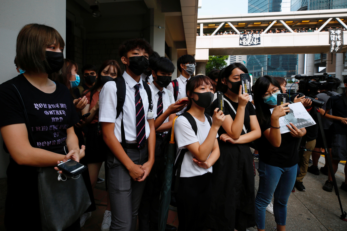 Outside the court, hundreds of protesters wore black masks in defiance of colonial-era emergency laws banning face coverings, which were brought in on Friday to quell the unrest but which have incited more violence.