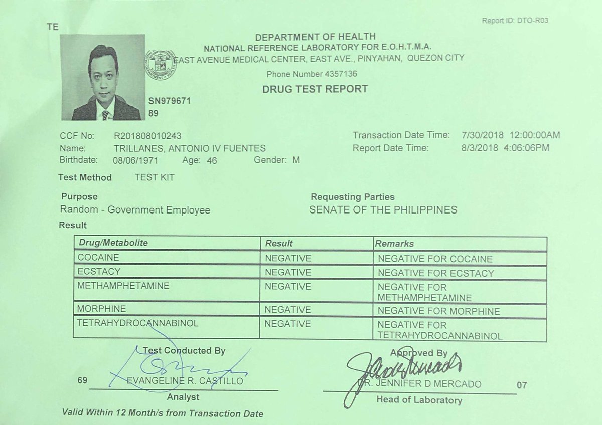 The senator tested negative for cocaine, ecstasy, methampethamine (shabu), morphine, and tetrahydrocannabinol (marijuana). He posted on Twitter the drug test report on August 15.