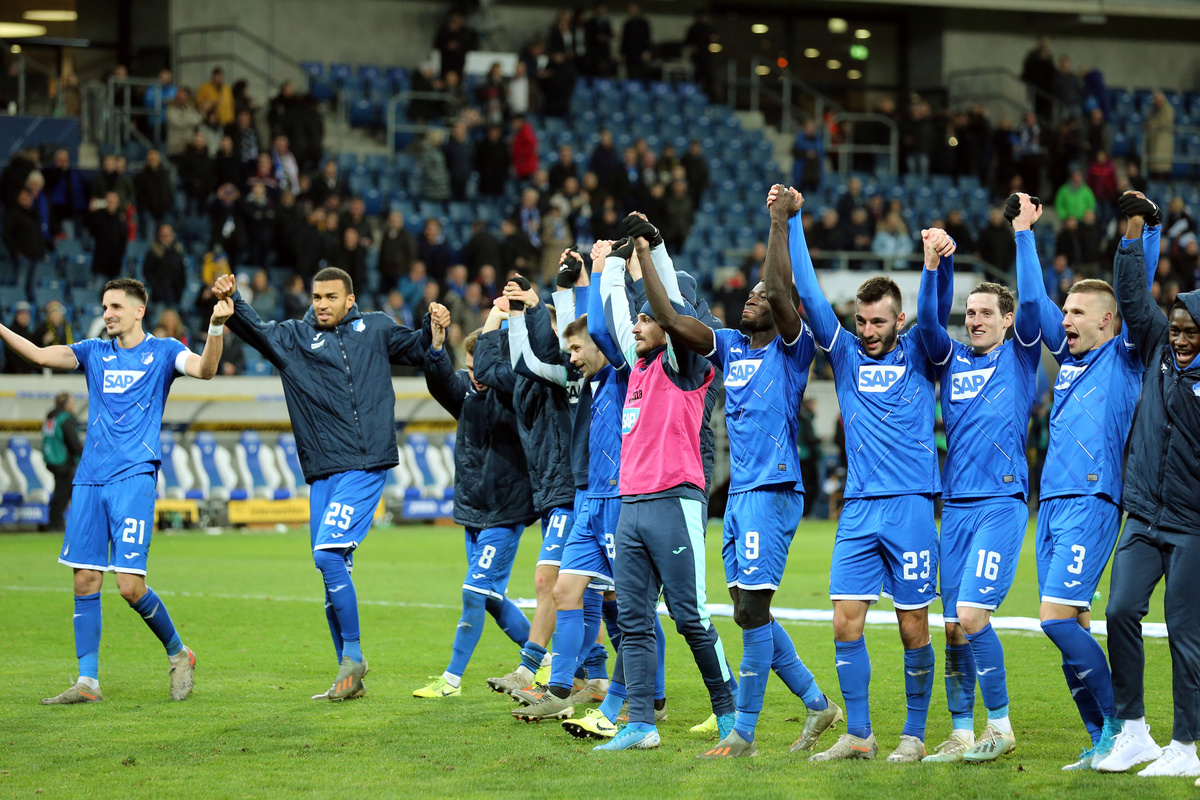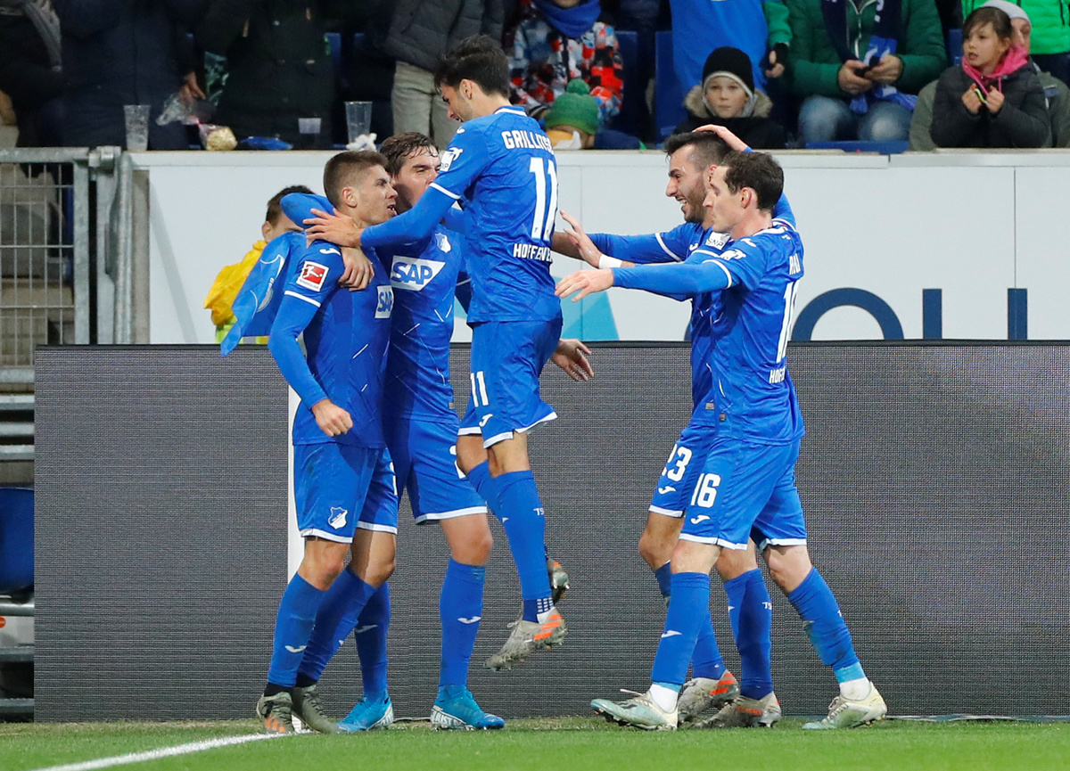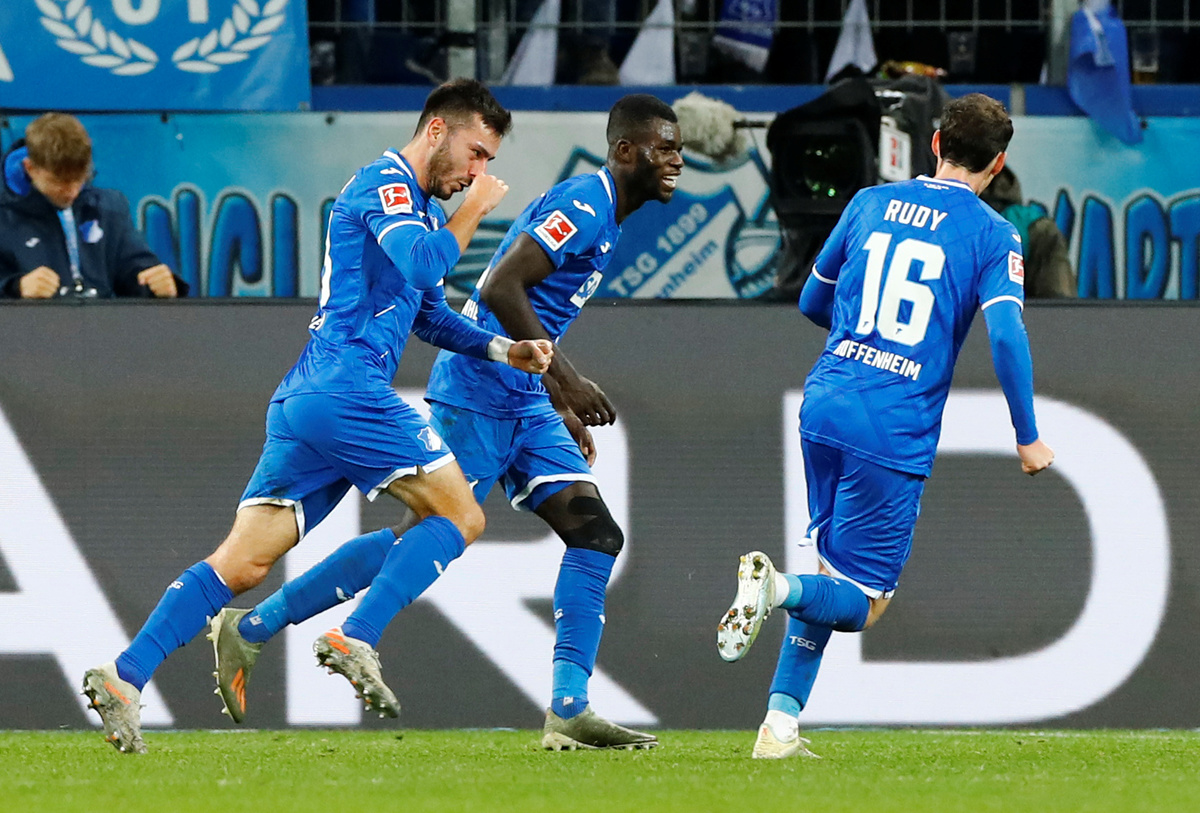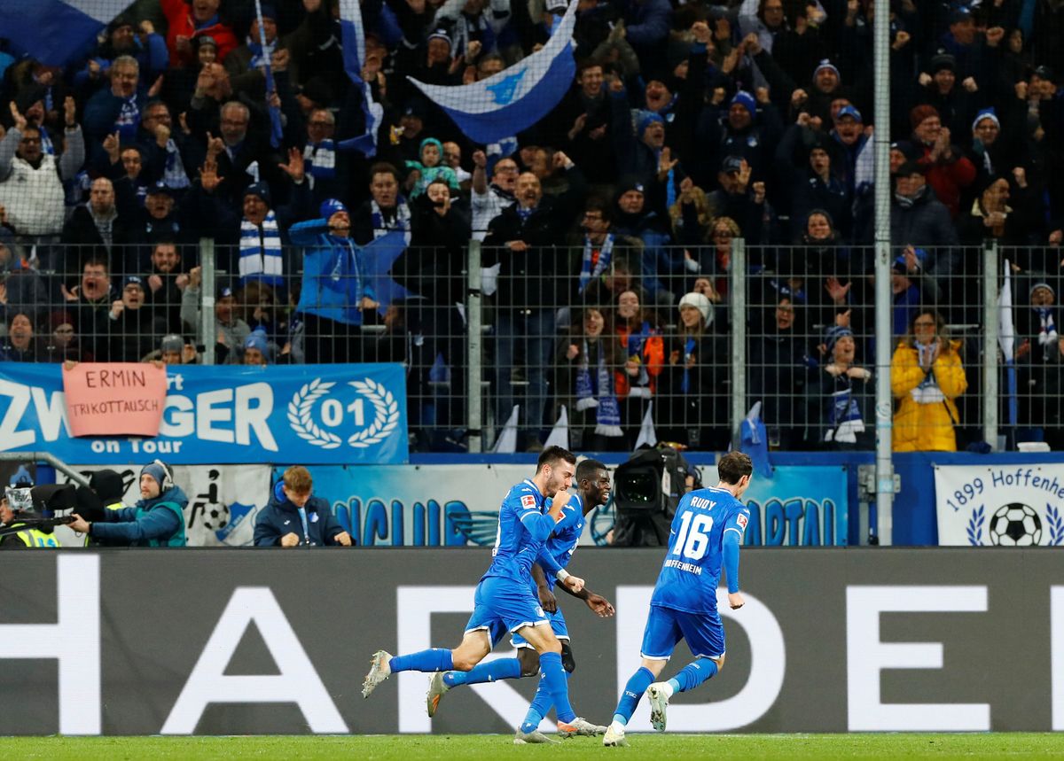 Soccer Football - Bundesliga - TSG 1899 Hoffenheim v Borussia Dortmund - PreZero Arena, Sinsheim, Germany - December 20, 2019 TSG 1899 Hoffenheim's Sargis Adamyan celebrates scoring their first goal with teammates REUTERS/Ralph Orlowski DFL regulations prohibit any use of photographs as image sequences and/or quasi-videoSoccer Football - Bundesliga - TSG 1899 Hoffenheim v Borussia Dortmund - PreZero Arena, Sinsheim, Germany - December 20, 2019 TSG 1899 Hoffenheim players celebrate after the match REUTERS/Ralph Orlowski DFL regulations prohibit any use of photographs as image sequences and/or quasi-video