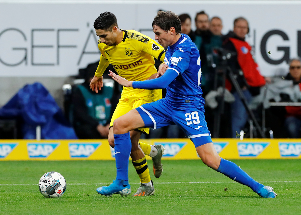 Soccer Football - Bundesliga - TSG 1899 Hoffenheim v Borussia Dortmund - PreZero Arena, Sinsheim, Germany - December 20, 2019 Borussia Dortmund's Achraf Hakimi in action with TSG 1899 Hoffenheim's Robert Skov REUTERS/Ralph Orlowski DFL regulations prohibit any use of photographs as image sequences and/or quasi-video