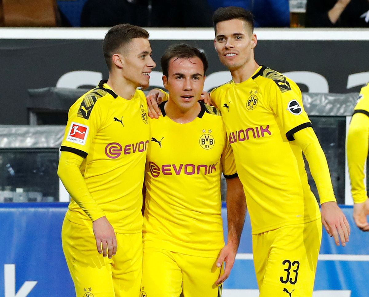 Soccer Football - Bundesliga - TSG 1899 Hoffenheim v Borussia Dortmund - PreZero Arena, Sinsheim, Germany - December 20, 2019 Borussia Dortmund's Mario Gotze celebrates scoring their first goal with teammates REUTERS/Ralph Orlowski DFL regulations prohibit any use of photographs as image sequences and/or quasi-video