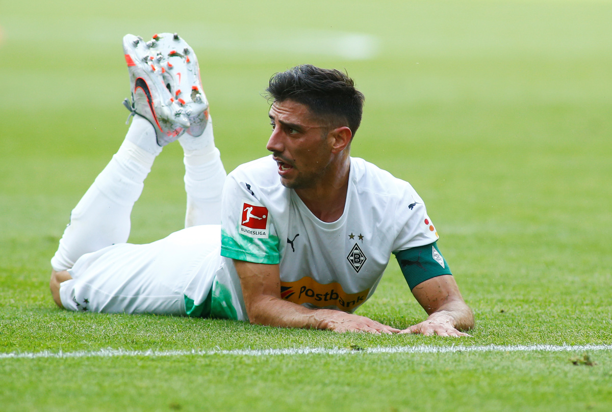 Soccer Football - Bundesliga - Borussia Moenchengladbach v VfL Wolfsburg - Borussia-Park, Moenchengladbach, Germany - June 16, 2020 Borussia Moenchengladbach's Lars Stindl in action with VfL Wolfsburg's Renato Steffen, following the resumption of play behind closed doors after the outbreak of the coronavirus disease (COVID-19) REUTERS/Thilo Schmuelgen/Pool