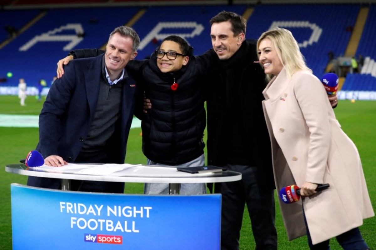 Soccer Football - Premier League - Cardiff City v Wolverhampton Wanderers - Cardiff City Stadium, Cardiff, Britain - November 30, 2018 Jamie Carragher, Gary Neville and Kelly Cates pose for a photo with a fan on the pitch before the match Action Images via Reuters/Peter Cziborra
