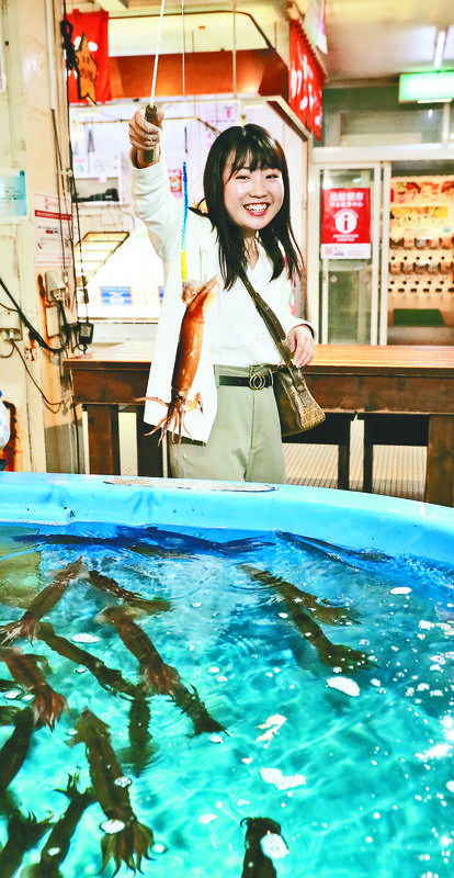 HAKODATE, Hokkaido -- I lowered a fishing rod to put a hook into a school of amber-colored surumeika Japanese flying squid swimming in an enclosure. Although I was given advice that hooking a squid by its fins is the key, my hook caught the squid's body. When I raised the rod, the squid squirted water at me.