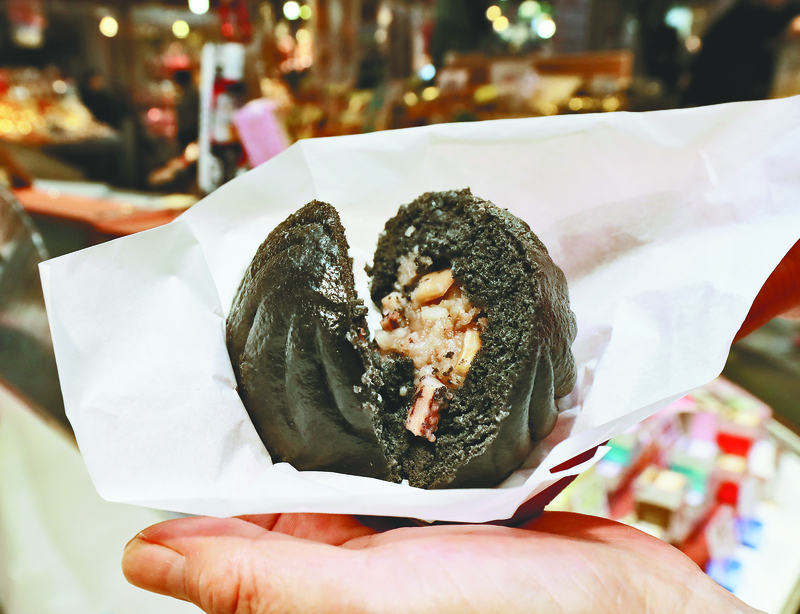 On shelves at the morning market are an array of such products, such as shredded and dried squid and ikameshi, a savory food that consists of a whole squid body cooked with rice inside. Some shops even sell steamed buns dyed with squid ink as well as cuttlefish ink pudding.