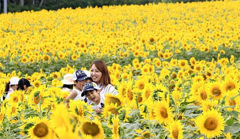 People stroll among a field in the town of Hokuryu, Hokkaido, one of the country's top destinations for viewing sunflowers. This year, about 2 million sunflowers, about 500,000 more than last year, were planted to bloom at different times over an about 23-hectare area. About 380,000 of them near an observation deck came into full bloom around last Saturday and will remain at their peak through Sunday.
