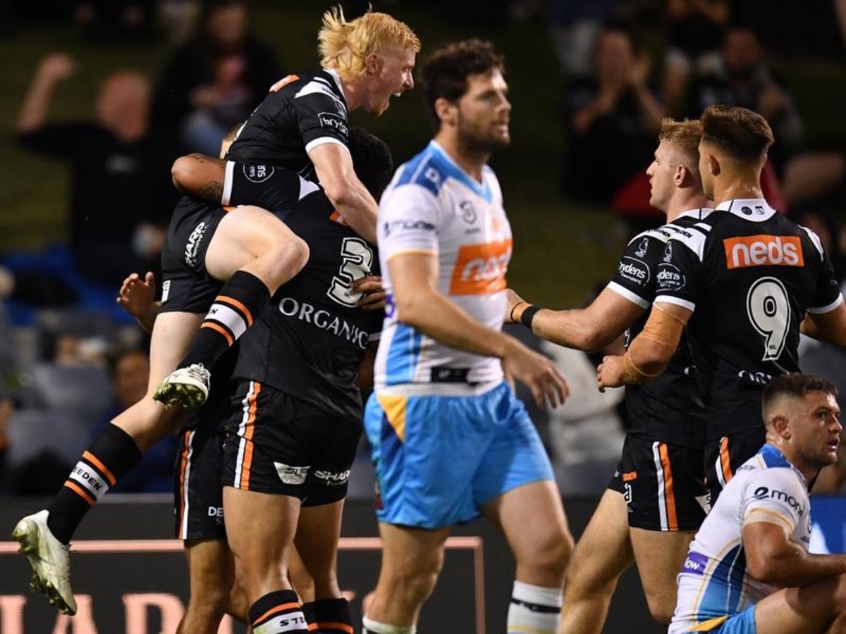 The Tigers scored three tries in the final 12 minutes, with one coming from a quick tap when the Gold Coast players were trying to request a captain's challenge.