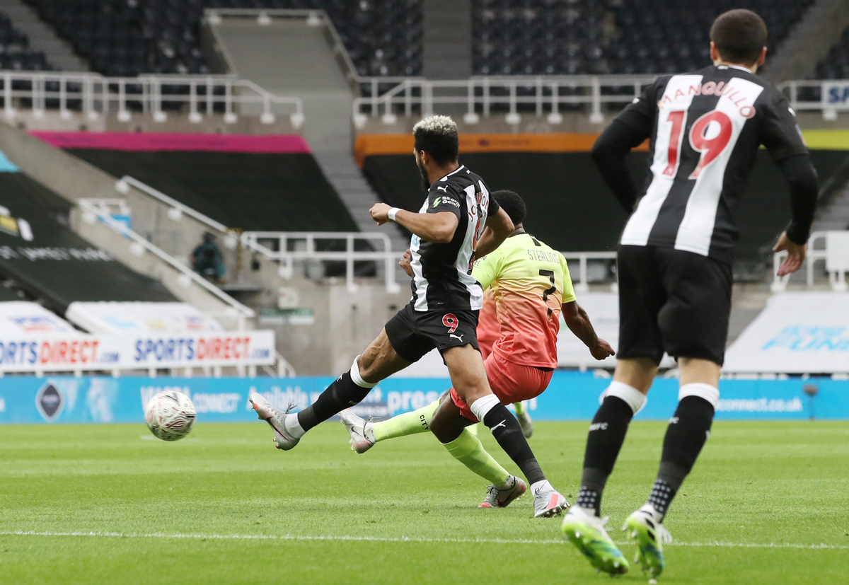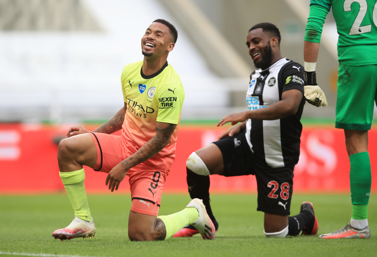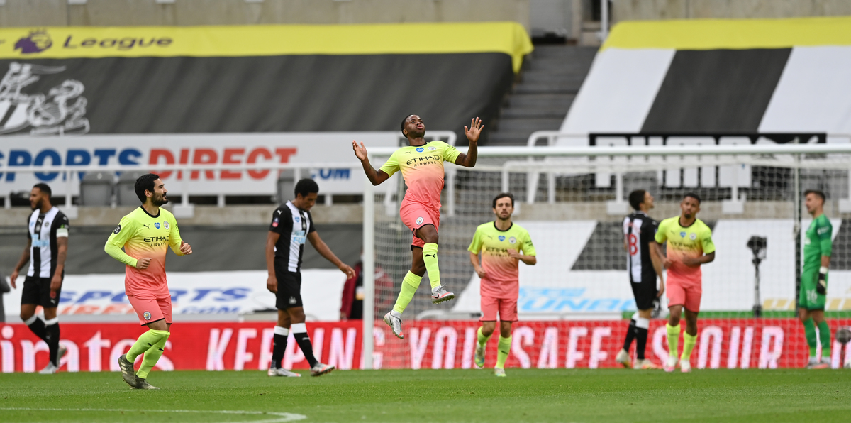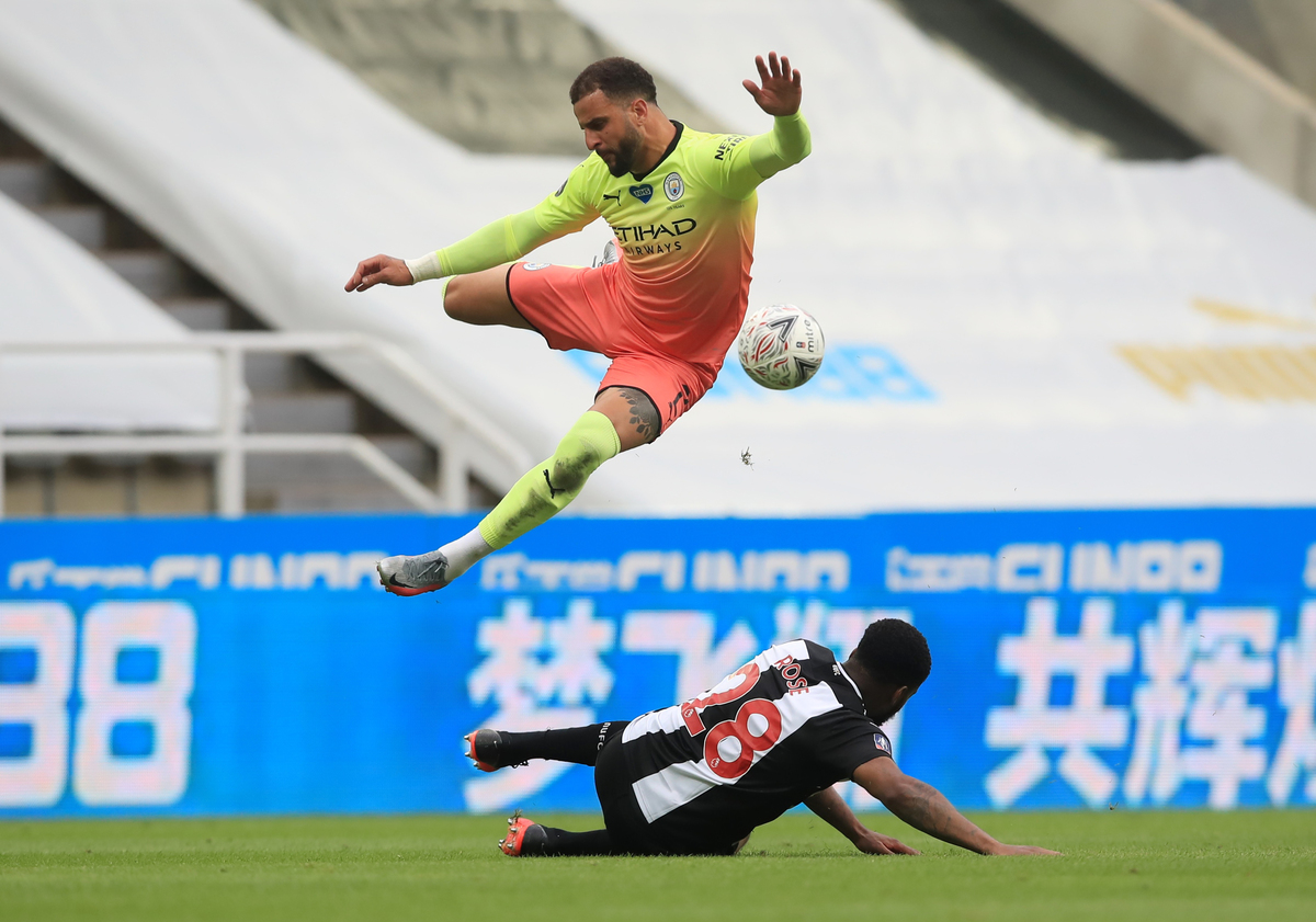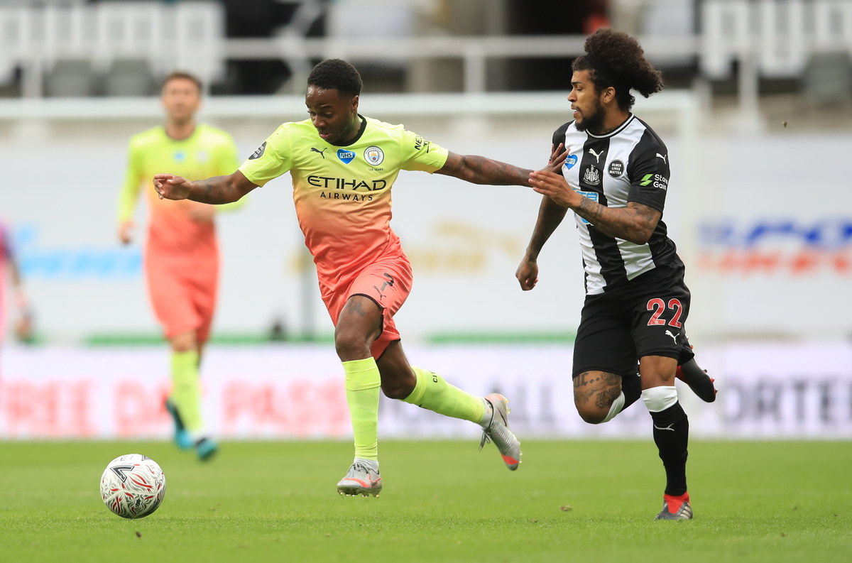 Soccer Football - FA Cup - Quarter Final - Newcastle United v Manchester City - St James' Park, Newcastle, Britain - June 28, 2020 Manchester City's Raheem Sterling in action with Newcastle United's DeAndre Yedlin, as play resumes behind closed doors following the outbreak of the coronavirus disease (COVID-19) Owen Humphreys/Pool via REUTERSSoccer Football - FA Cup - Quarter Final - Newcastle United v Manchester City - St James' Park, Newcastle, Britain - June 28, 2020 Manchester City's Kyle Walker in action with Newcastle United's Danny Rose, as play resumes behind closed doors following the outbreak of the coronavirus disease (COVID-19) Owen Humphreys/Pool via REUTERSSoccer Football - FA Cup - Quarter Final - Newcastle United v Manchester City - St James' Park, Newcastle, Britain - June 28, 2020 Newcastle United's Fabian Schar in action with Manchester City's Raheem Sterling, as play resumes behind closed doors following the outbreak of the coronavirus disease (COVID-19) Shaun Botterill/Pool via REUTERSSoccer Football - FA Cup - Quarter Final - Newcastle United v Manchester City - St James' Park, Newcastle, Britain - June 28, 2020 Manchester City's Gabriel Jesus and Newcastle United's Danny Rose react, as play resumes behind closed doors following the outbreak of the coronavirus disease (COVID-19) Owen Humphreys/Pool via REUTERS