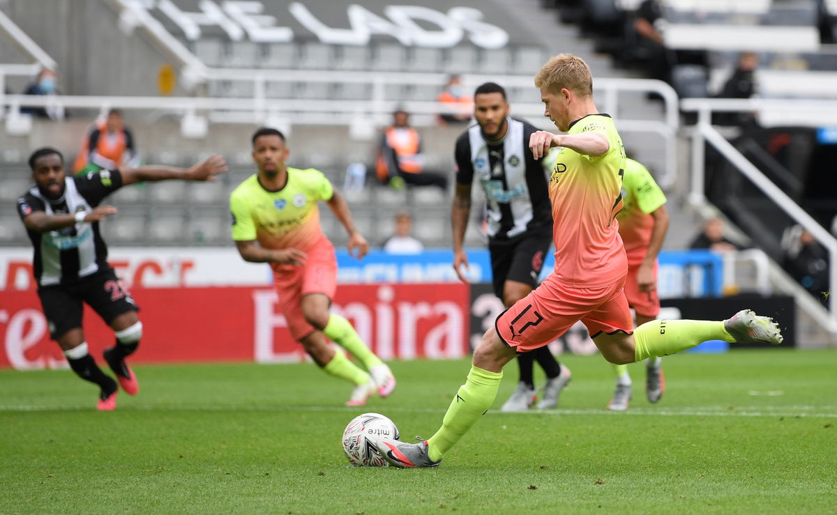 Soccer Football - FA Cup - Quarter Final - Newcastle United v Manchester City - St James' Park, Newcastle, Britain - June 28, 2020 Manchester City's Kevin De Bruyne scores their first goal from the penalty spot, as play resumes behind closed doors following the outbreak of the coronavirus disease (COVID-19) Shaun Botterill/Pool via REUTERS