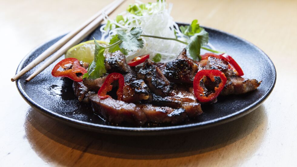 Dish: Vietnamese Pork (Berkshire pork with fresno chili, green onion and cilantro caramelized over binchotan charcoal)
