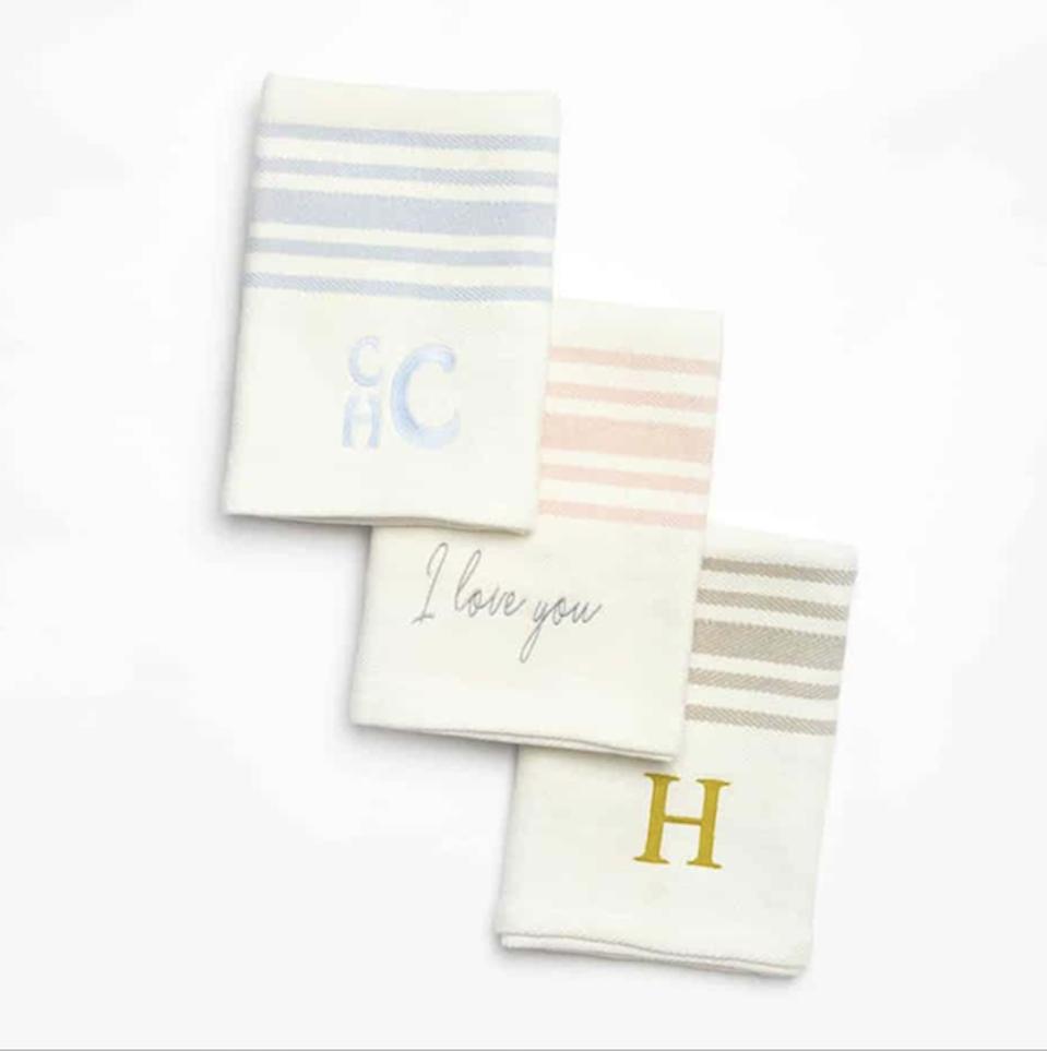 This custom baby blanket from Coley Home is thoughtful and sweet-looking. Made from cotton and adorned with a choice of pink, blue or green stripes, it features a choice of monograms and symbols in a variety of colors and embroidery.