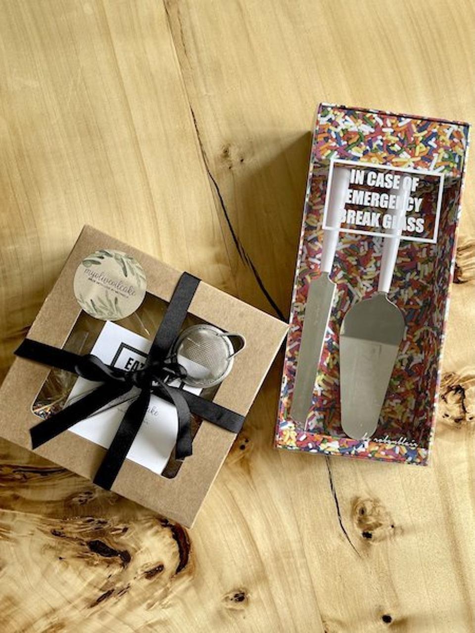 So, this gift is technically $105, but it’s really two gifts in one. It includes the Instagram artist’s chic cake server set with a knife and serving piece, along with a delicious olive oil cake. What a festive and fabulous combination.