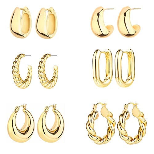 6 Pairs 14K Gold Hoop Earrings for Women Lightweight Chunky Hoop Earrings Multipack Hypoallergenic, Thick Open Twisted Huggie Hoops Earring Set Jewelry for Gifts. (Gold)