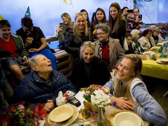 Surrounded by more than 100 fellow Holocaust survivors and young volunteers, a blind Ernest Weiner sat in his wheelchair with a puffy crown on his head as the crowd sang happy birthday and showered him with hugs and greetings.