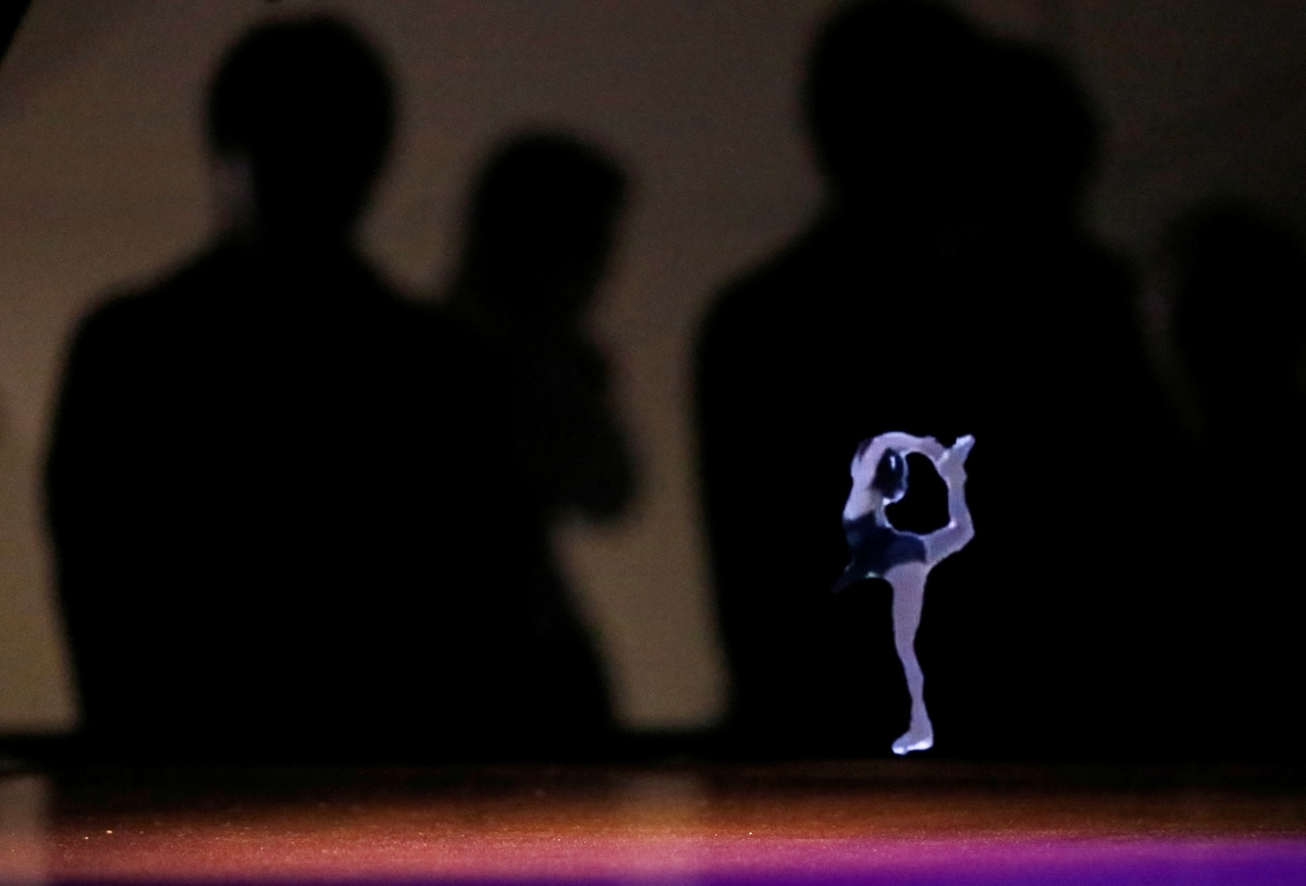 Japanese telecommunications company NTT's "Kirari! for Arena", which uses multiple cameras to track the movements of the player and images are transported to devices which show 3D hologram figures in real-time at a different location, shows a figure skater during the company's exhibition in Tokyo, Japan, February 22, 2018. REUTERS/Toru Hanai