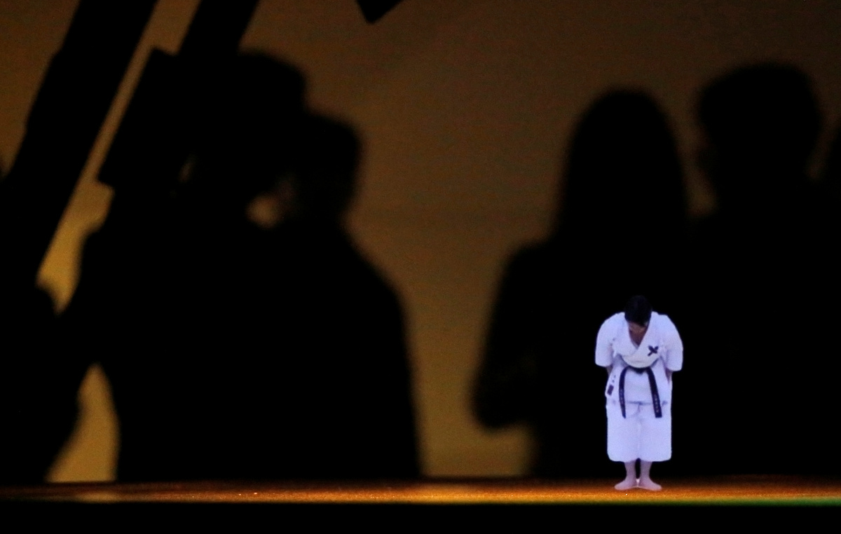 Japanese telecommunications company NTT's "Kirari! for Arena", which uses multiple cameras to track the movements of the player and images are transported to devices which show 3D hologram figures in real-time at a different location, shows a karateka during the company's exhibition in Tokyo, Japan, February 22, 2018. REUTERS/Toru Hanai