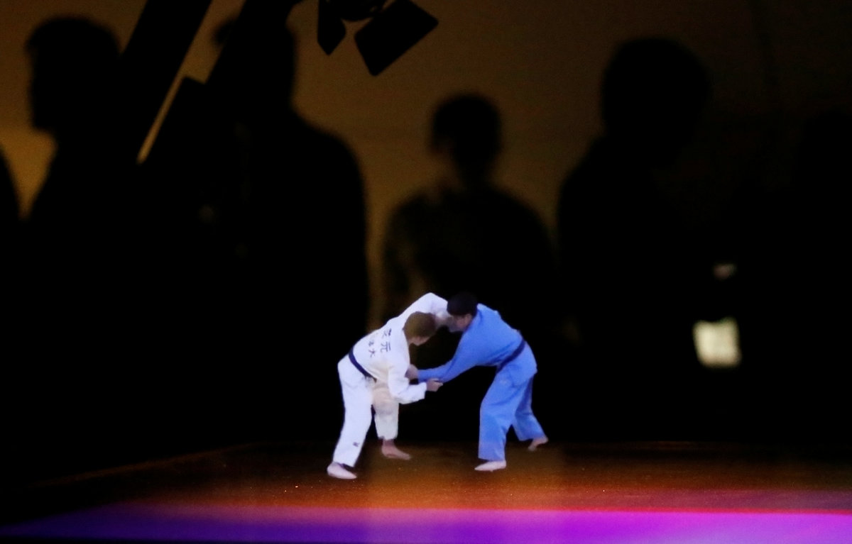 Japanese telecommunications company NTT's "Kirari! for Arena", which uses multiple cameras to track the movements of the player and images are transported to devices which show 3D hologram figures in real-time at a different location, shows judoka during the company's exhibition in Tokyo, Japan, February 22, 2018. REUTERS/Toru Hanai