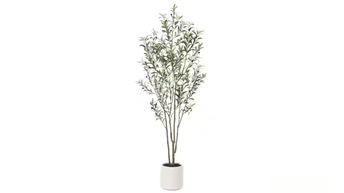 In a foyer, living room or sunroom, this 7-foot potted artificial olive tree from Home Depot will bring a bit of nature into your home, no watering required. Adorn with LED fairy lights for a whimsical touch in any season or leave it as-is for a classic look year-round. The white planter pot matches any décor and provides a stable base for the tree.