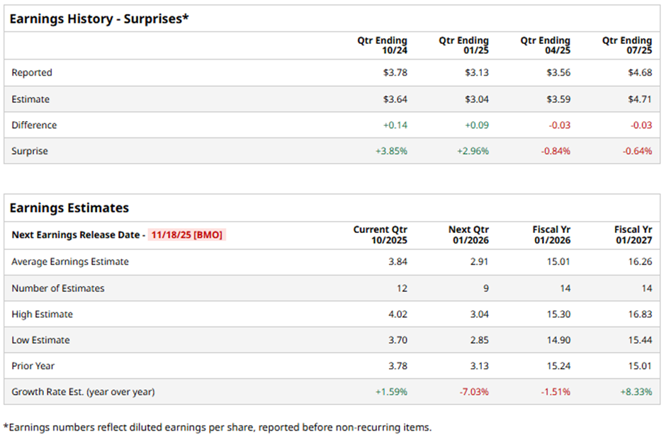 The Atlanta, Georgia-based company is expected to announce its fiscal Q3 2025 results before the market opens on Tuesday, Nov. 18. Ahead of this event, analysts forecast Home Depot to report an adjusted EPS of $3.84, up 1.6% from $3.78 in the year-ago quarter. It has surpassed Wall Street's earnings estimates in two of the last four quarters while missing on two other occasions.