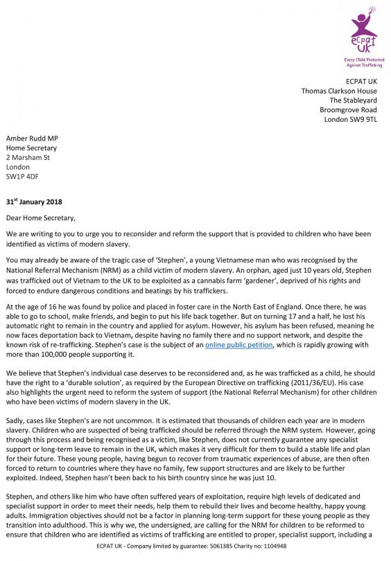 An open letter to the Home Secretary, penned by leading child trafficking charity ECPAT UK and signed by 29 charities and organisations including Barnardo’s and the Children’s Society, calls on Amber Rudd to reconsider the decision and reform the support provided to all children identified as victims of modern slavery in the UK.