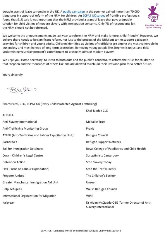 Chloe Setter, head of advocacy, policy and campaigns at ECPAT UK, said: “As Stephen’s case sadly demonstrates, being recognised by the National Referral Mechanism as a victim of trafficking does not currently guarantee children any specialist support or long-term leave to remain in the UK.