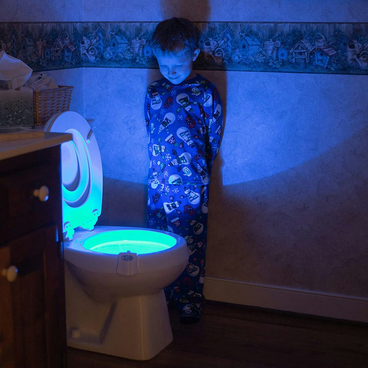 A toilet bowl night-light that automatically turns on