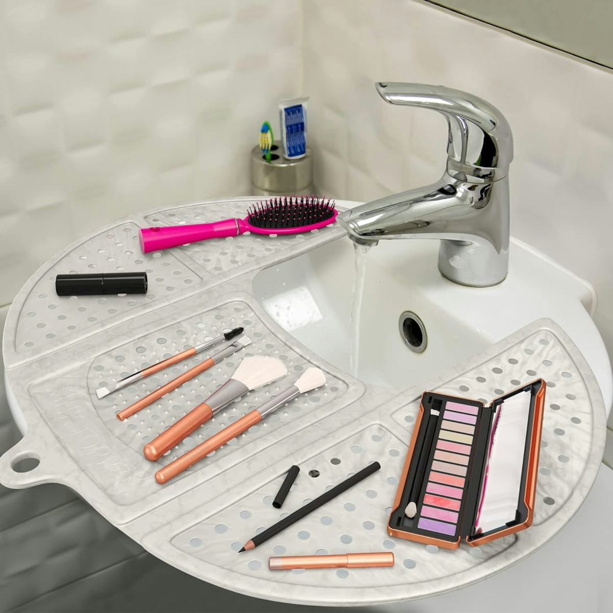 If you deal with limited space in your bathroom, you’ll very much appreciate this bathroom sink cover for your stuff. Made from foldable silicone, it works great as a hot tool mat, a cleaning surface for brushes, or just as a place to hold your toiletries as you get ready. It also has an impressive 4.7 out of five-star rating.