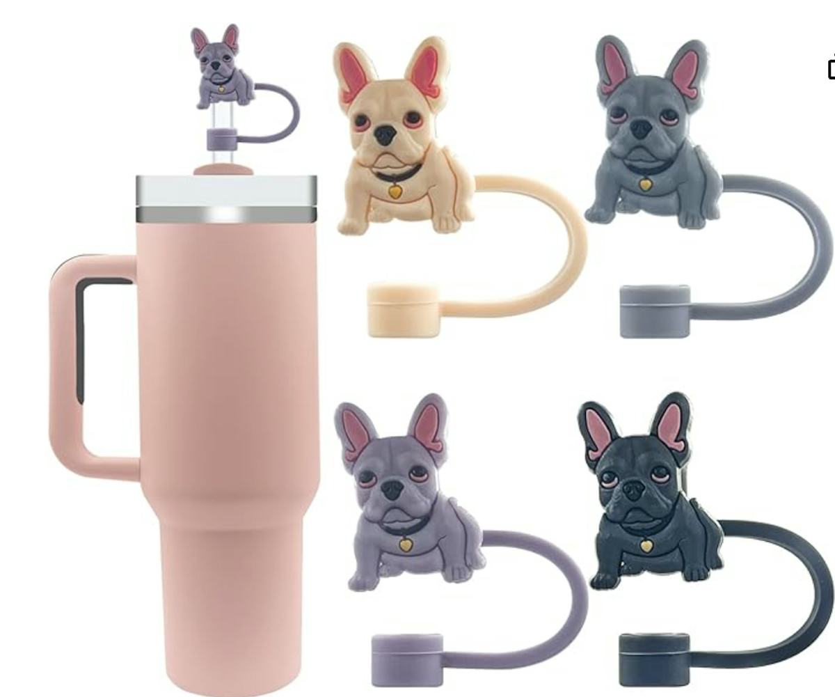 These cute Frenchie dog straw covers are basically little guardians for your tumbler, preventing splashes and spills. The set comes with four caps made from soft, flexible silicone that fit 20, 30, and 40-ounce cups. They’re easy to pop on and off, and they come in a mix of designs that make hydration a little more fun.
