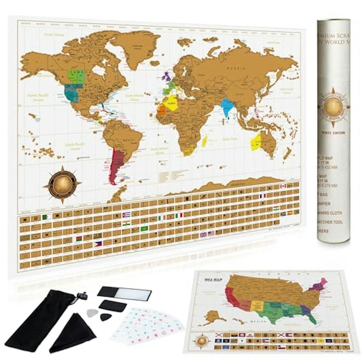 InnovativeMap Scratch Off World Map Poster and Deluxe United States Map - Includes Complete Accessories Set & All Country Flags - Premium Wall Art Gift for Travelers - Map of the World, White Map