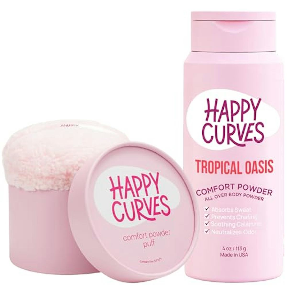 HAPPY CURVES Comfort Powder: Talc Free Anti Chafe Body & Foot Powder Deodorant to Control Inner Thigh Chafing, Private Areas, and All Over Body for Women (4 Ounce (Pack of 1), Tropical + Puff)